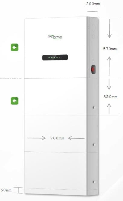 De HYXiPOWER All-In-One heeft een modern, neutraal ontwerp met compacte afmetingen (700 mm breed, 350 mm diep, hoogte afhankelijk van de configuratie). Veiligheid staat voorop: